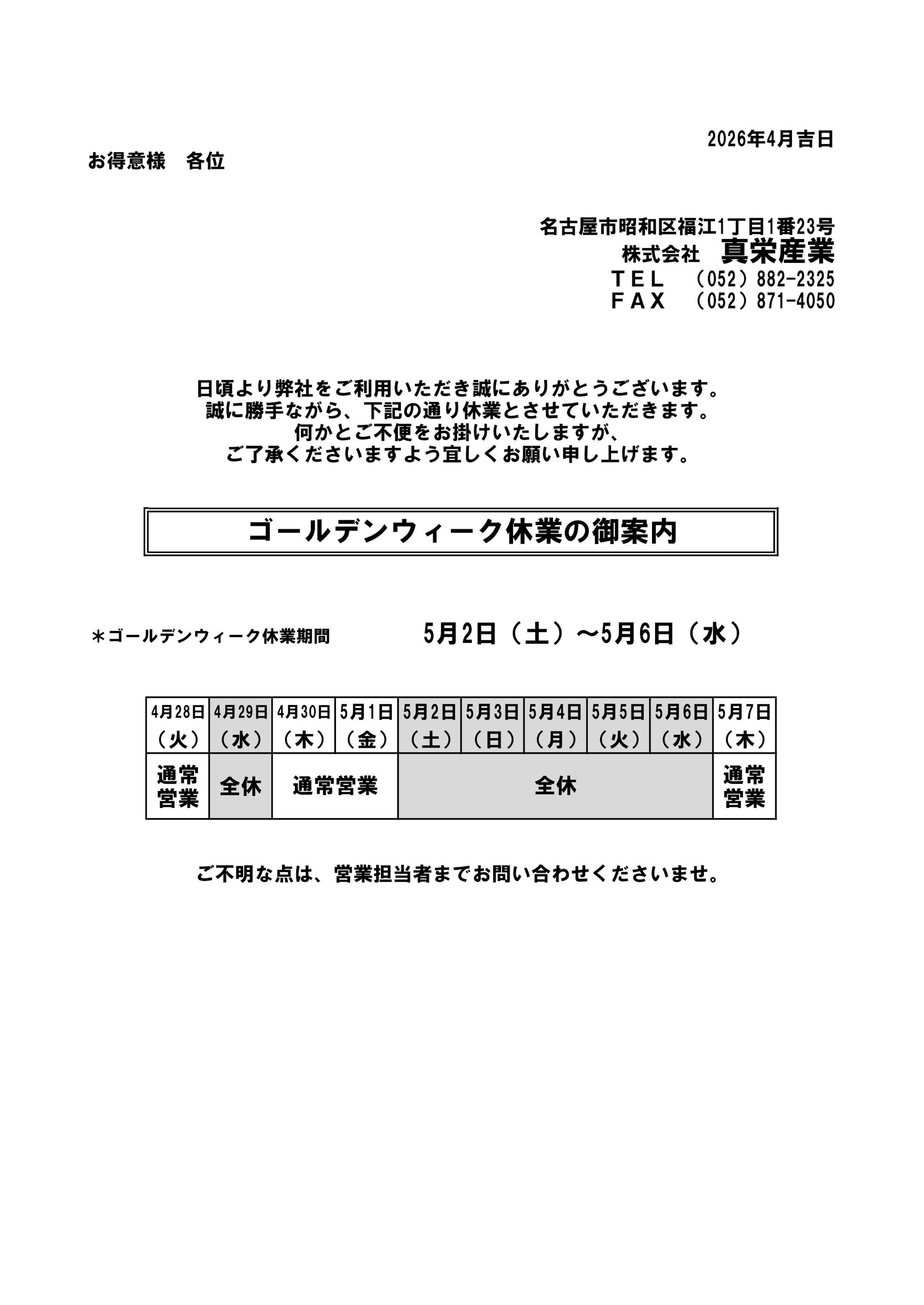 GW休暇の御案内💁...